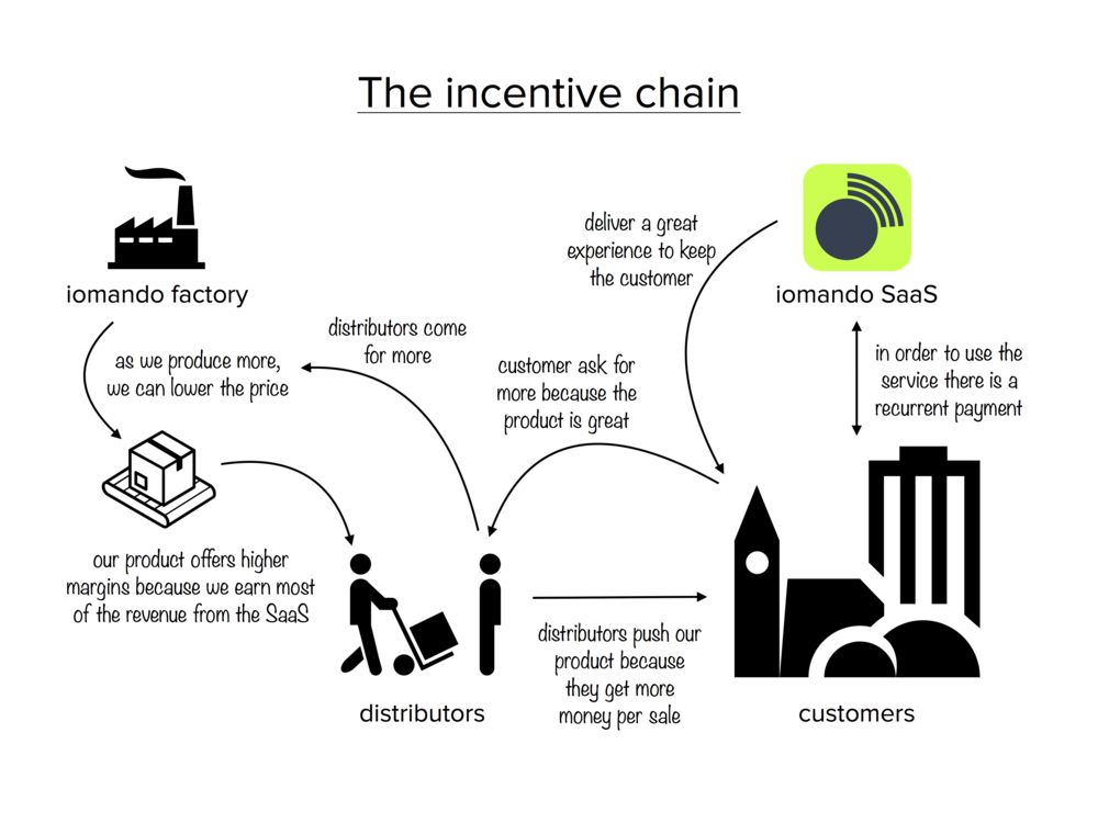 iomando operates a double-sided business model that provides a classic markup sale for distributors, but also enables a SAAS to run on top — which was the result of several failed attempts to fit a software-based solution within a traditionally hardware-based industry.