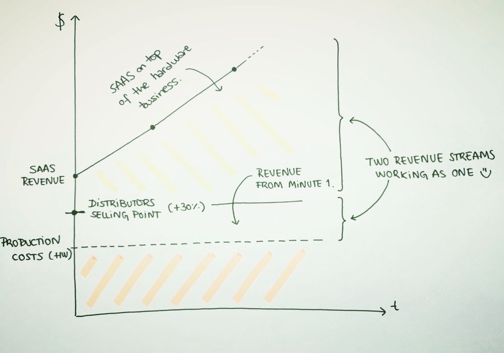 Now, we directly sell our hardware to distributors. It has a price and they sell it to the customers with a markup and an installation cost. No more “renting”. The customer buys the hardware and owns it. Therefore, on this side, we drive a classic ~30% markup business that is paid up front and finances almost all the manufacturing costs and operations. Prior to that, the cost of the hardware was bundled onto the subscription and we were “losing money” on every single sale, hoping the LTV of the customer would account for that in the future.